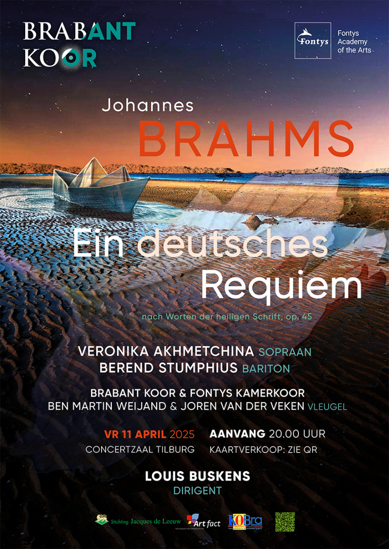 In April of 2025, there was another collaboration project between the Fontys Chamber Choir and Brabantkoor. For Ilse, her third and last as a part of her Ba in Tilburg. This time they performed Ein Deutsches Requiem by Johannes Brahms in a setting with two grand pianos, behind them Ben Martin Weijand and Joren van der Veken, and with Han Vogel on timpani. This project was led by conductor Louis Buskens and performed on the 11th of April in Concertzaal Tilburg